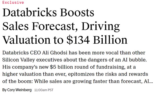 不过,与此同时,Databricks的联合创始人兼CEO阿里·戈德西(Ali Ghodsi)却拉响了AI泡沫的警报,他认为其他AI公司的高管对AI短期内的能力过于乐观。在今年9月份与高盛CEO大卫·所罗门(David Solomon)的一次访谈中,戈德西称:“现在行业还处于早期阶段。这就是为什么我们处于泡沫之中,对吧?”