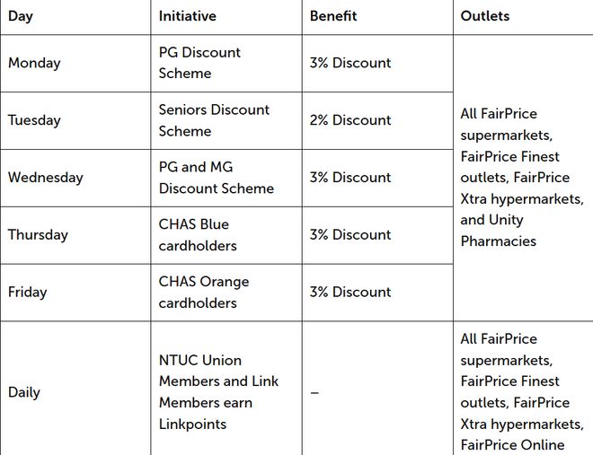 建国一代(PG)、立国一代(MG)以及橙色和蓝色社保援助计划卡(CHAS Card)持有人可分别在每个星期的指定日子里长安美人鱼报价,享有2%到3%的折扣优惠。